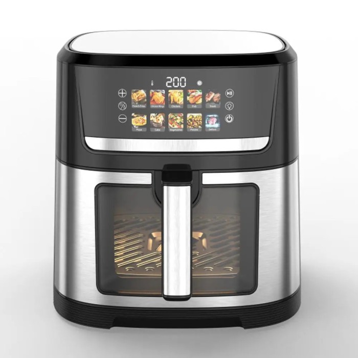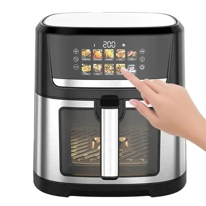 Сенсорная панель управления с подсвечиваемыми индикаторами позволяет легко выбрать режим, установить температуру (от 80°C до 200°C) и таймер до 60 минут. Прозрачная дверца с обзорным окном дает возможность наблюдать за процессом приготовления без потери тепла.