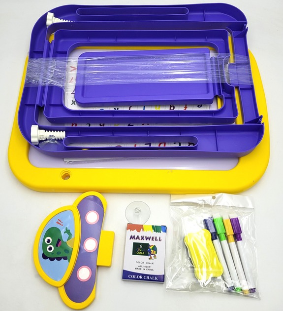 Надёжная 4-точечная конструкция обеспечивает устойчивость, а регулируемая высота позволяет подстроить мольберт под рост ребёнка. В нижней части расположена удобная полка для аксессуаров — туда можно положить мел, маркеры, губку или другие принадлежности. Все материалы безопасны, нетоксичны и рассчитаны на длительное использование.