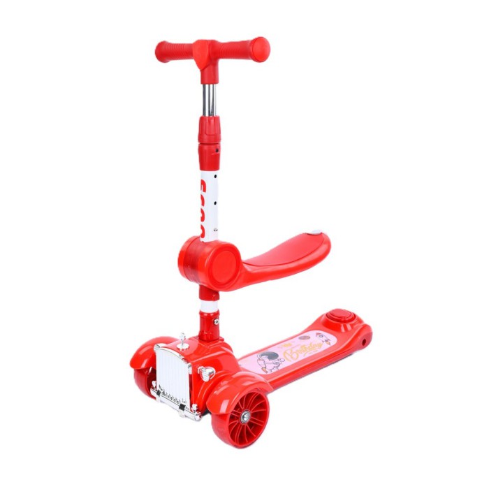 Самокат оснащен светящимися колесами и музыкальными эффектами, которые делают катание еще веселее и заметнее в любое время суток.