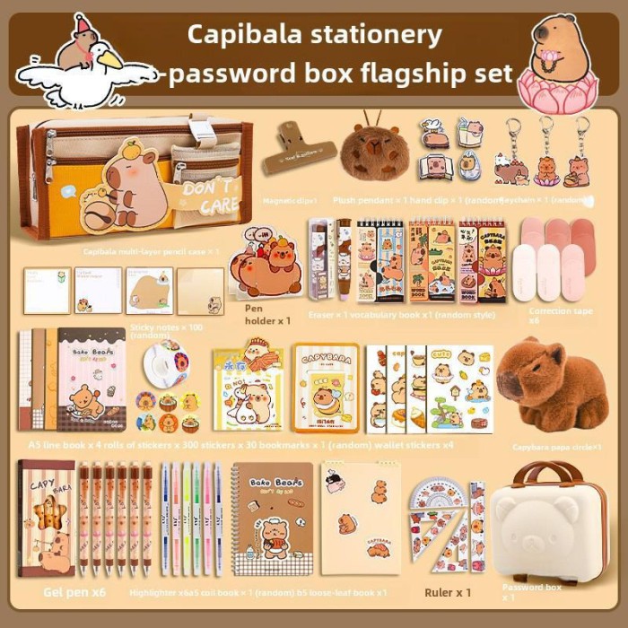 Погрузитесь в мир творчества, вдохновения и ярких эмоций с большим канцелярским набором в стильном бежевом чемодане с милым дизайном «Капибара». Этот набор станет незаменимым спутником для детей, подростков и креативных взрослых: в нем собрано всё необходимое для учебы, рисования, заметок и планирования.