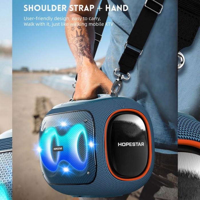 Hopestar PARTYBOX оснащена тремя динамиками общей мощностью 120 Вт — два по 20 Вт и один сабвуфер на 80 Вт. Такое сочетание обеспечивает насыщенные басы, кристально чистые высокие частоты и динамичное звучание во всём диапазоне от 40 Гц до 20 кГц. Колонка создаёт атмосферу настоящего концерта, где бы вы ни находились.