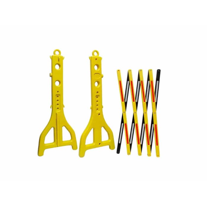 Переносной раздвижной барьер «Гармошка» сделан из пластика желтого цвета, и имеет полые опорные ножки с широким основанием.