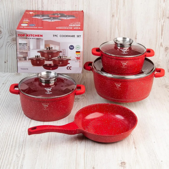 Набор кастрюль и сковорода Top Kitchen — алюминиевая посуда с прочным антипригарным гранитным покрытием и жаропрочными стеклянными крышками (красный, черный)