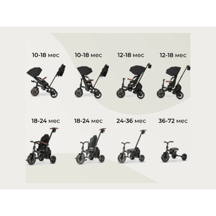Tri-cycle COMFO MAX — это современный трёхколёсный детский велосипед-трансформер для детей от 10 месяцев до 6 лет, который сочетает в себе комфорт, безопасность и функциональность. Благодаря 8 вариантам трансформации велосипед легко адаптируется под возраст и потребности ребёнка, превращаясь из беговела в прогулочный велосипед или коляску.