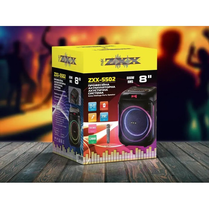 ZXX-5502 – це не просто колонка, а повноцінна мобільна аудіо-система, яка поєднує якісний звук, світлове шоу, караоке та універсальність у використанні. Ідеально підходить для вечірок, концертів, шкільних заходів, весіль та будь-яких подій, де потрібен голосний і чіткий звук.