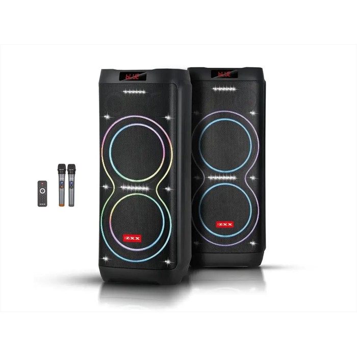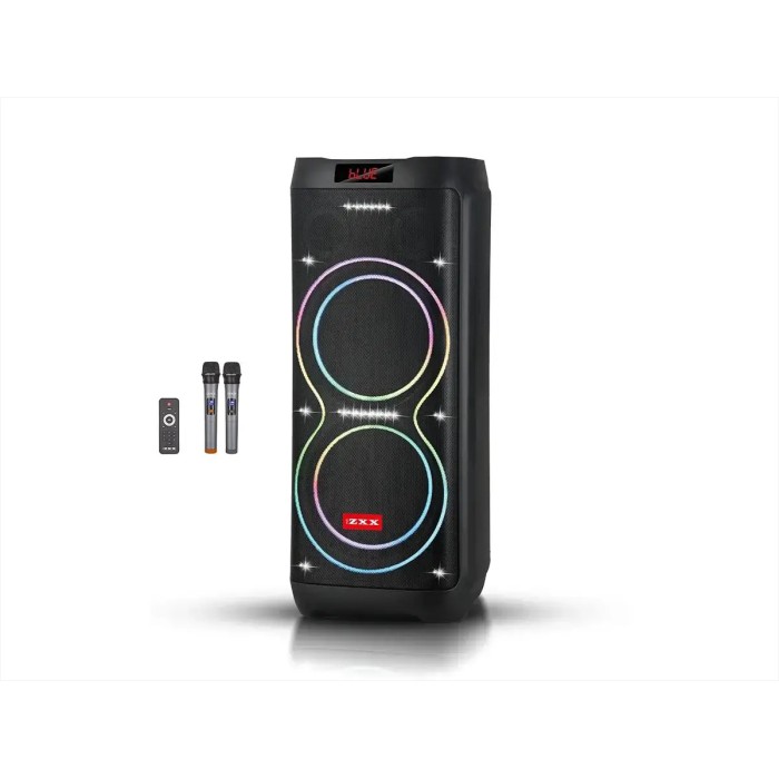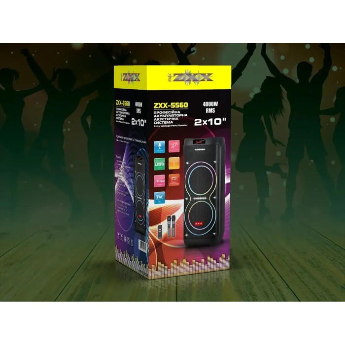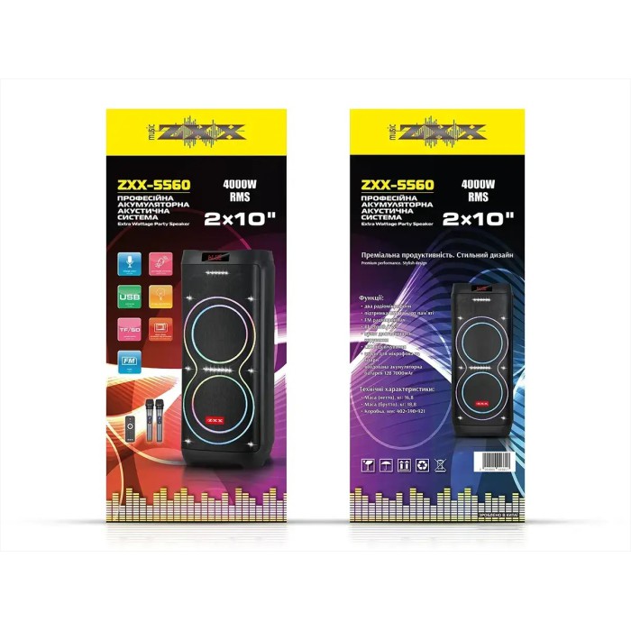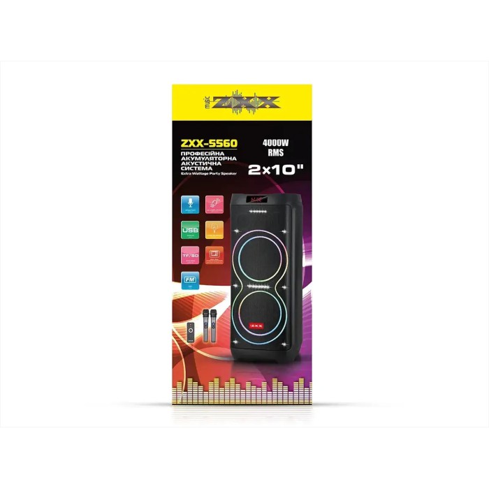 Акустична портативна колонка ZXX-5560 100Вт 2x10" з Bluetooth, TWS, LED-підсвіткою, FM-радіо, USB/TF, функцією запису, двома мікрофонами та пультом ДК