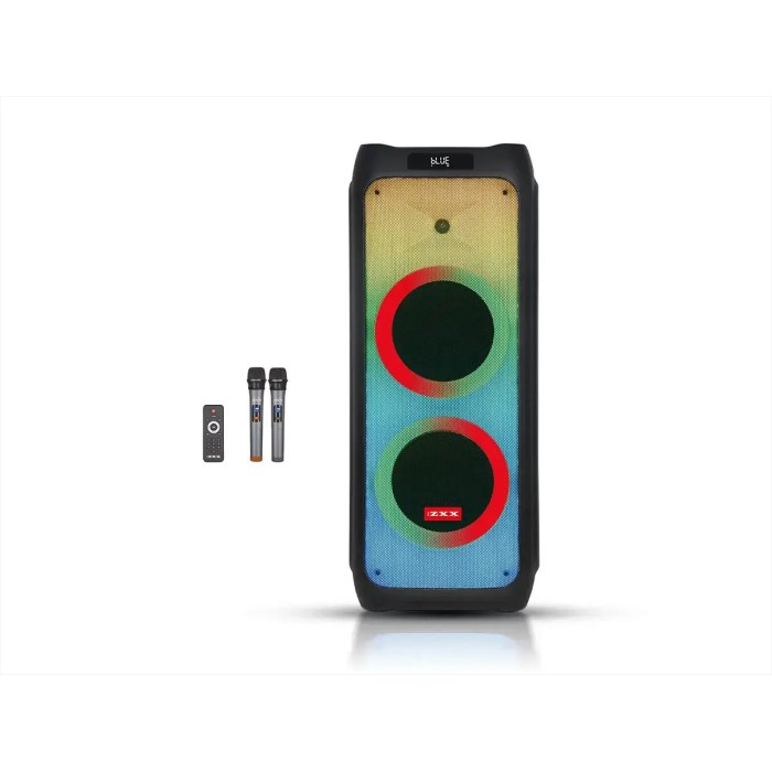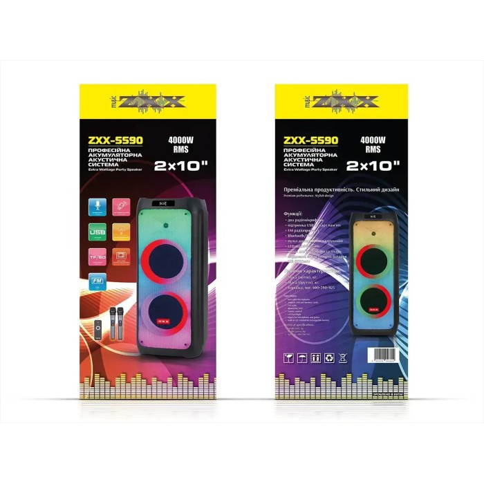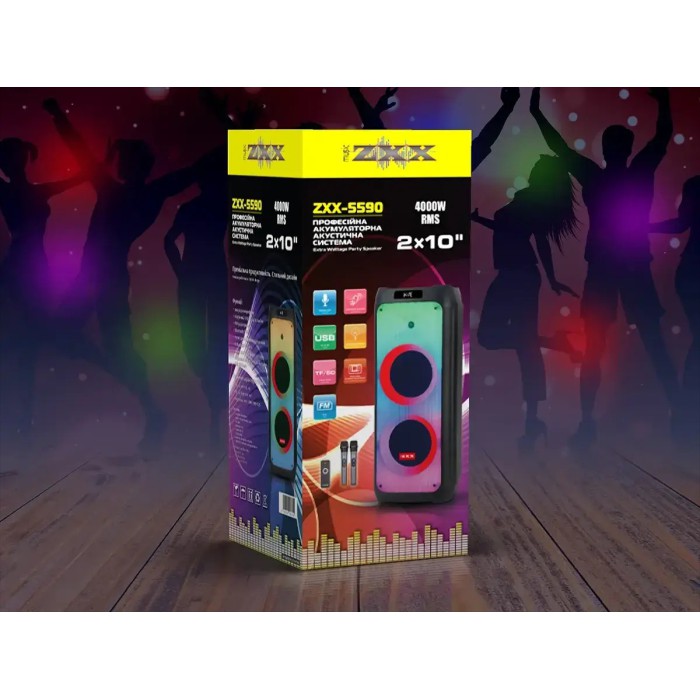 Акустична портативна колонка ZXX-5590 (100Вт, 2×10") із LED-підсвіткою, Bluetooth, TWS, FM, USB, TF, REC, 2 мікрофонами та пультом ДК — це потужна, багатофункціональна підлогова акустична система, створена для справжніх поціновувачів якісного звуку та яскравих емоцій.