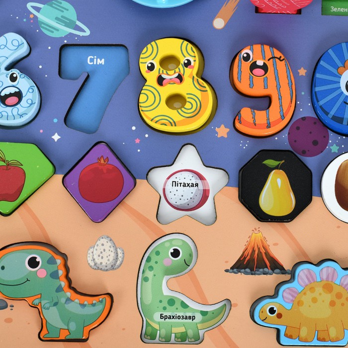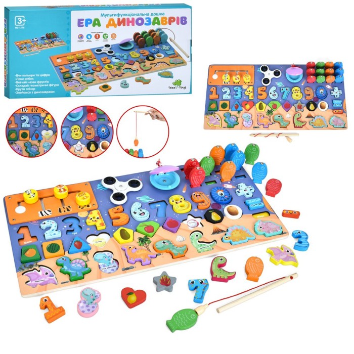 Дерев'яна багатофункціональна гра-сортер TREE TOYS – навчальна дошка для дітей з ігровим полем, цифрами, математичними знаками, фігурами (фрукти), динозаврами, магнітною риболовлею (1 вудка, 12 рибок), спінером та лабіринтом