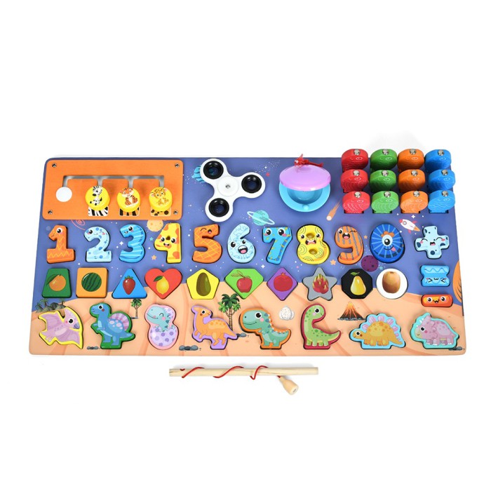 Комплектація включає магнітну риболовлю з 1 вудкою та 12 рибками, що розвиває концентрацію та дрібну моторику. Також на дошці є лабіринт, спінер та кольорові елементи для сортування, що роблять гру різноманітною та цікавою.