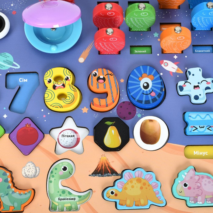 • Комплектація: цифри 0-9, математичні знаки, фігури (фрукти, динозаври), магнітна вудка, 12 рибок, лабіринт, спінер