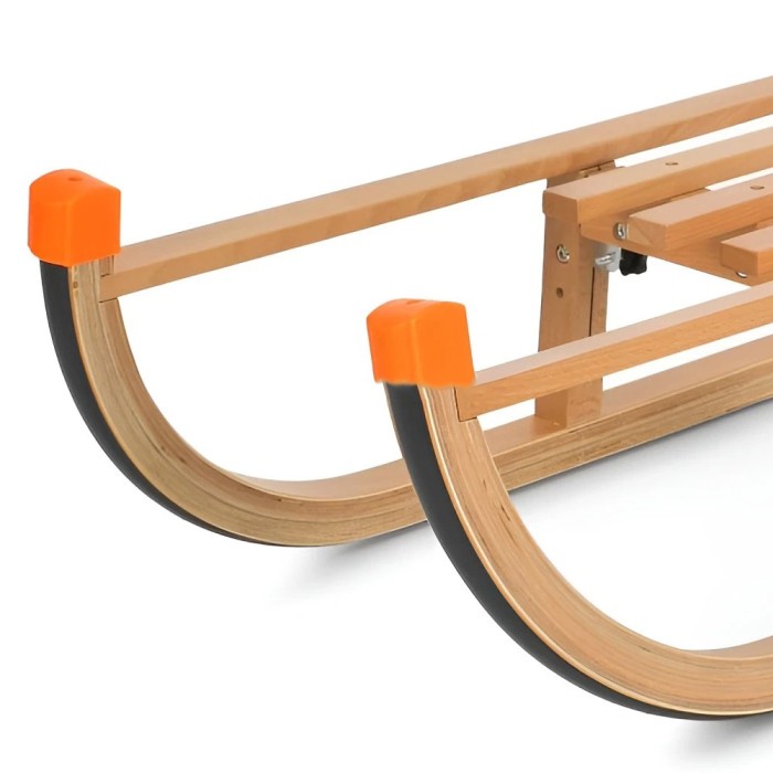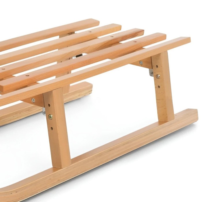 Санки виготовлені з міцного дерева, що забезпечує надійність конструкції, а металеві кріплення гарантують стійкість навіть при активному використанні. Полоззя з пластиковими накладками роблять ковзання плавним і м’яким, дозволяючи легко рухатися по снігу та льоду.