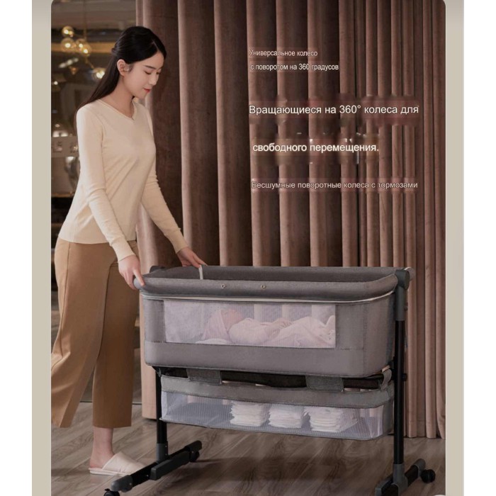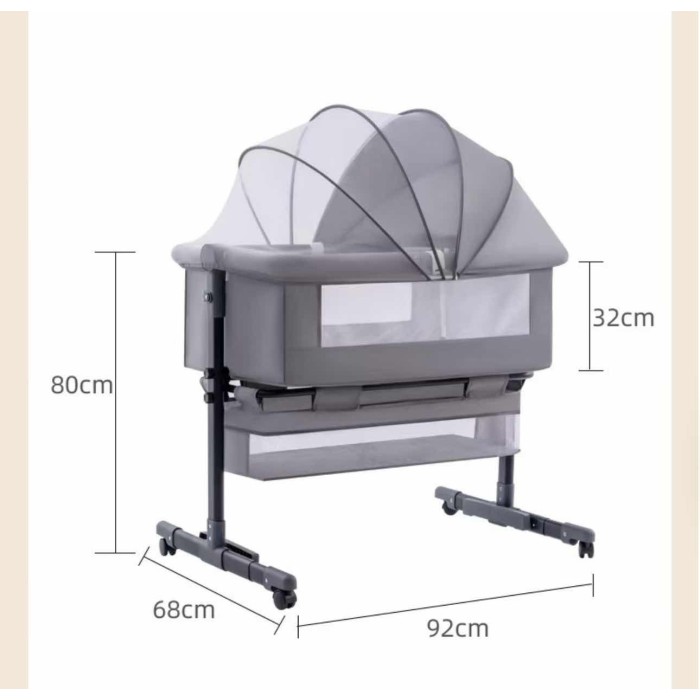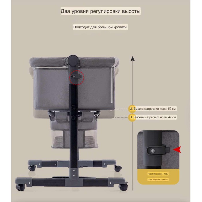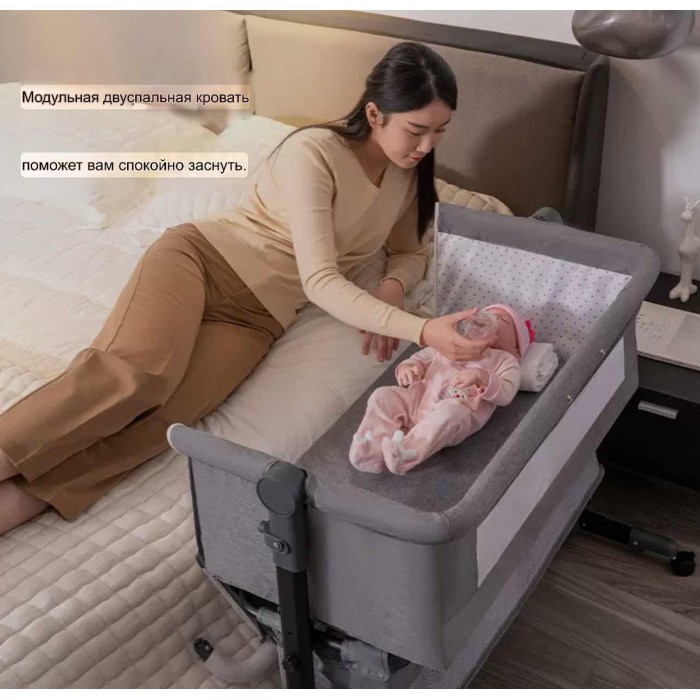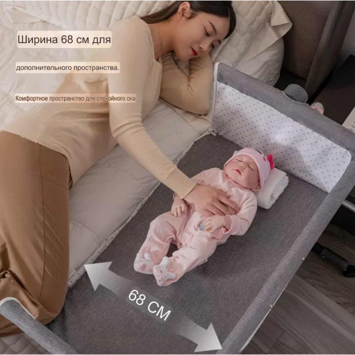 Міцний металевий каркас забезпечує надійність і стійкість, а дихаючі гіпоалергенні матеріали створюють комфортний мікроклімат для малюка. Функція плавного гойдання допомагає швидше заспокоїти дитину та сприяє легкому засинанню. Регулювання висоти дозволяє ідеально підлаштувати ліжечко до рівня батьківського ліжка, забезпечуючи безпечний спільний сон.