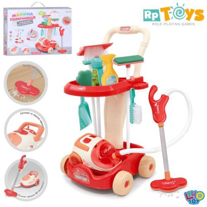 Дитячий набір для прибирання 8009 — візок, пилосос зі звуком і світлом, 10 предметів, у коробці