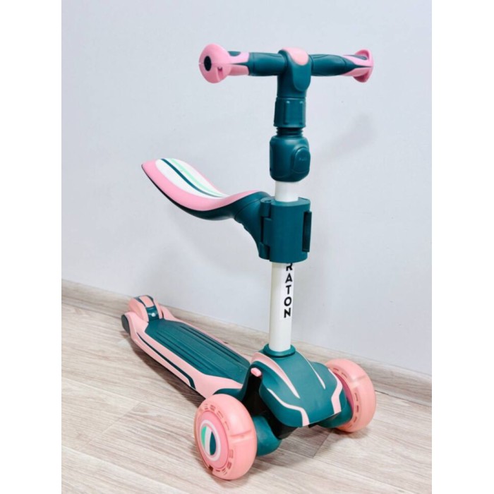 Дитячий самокат Maraton Flex 2 в 1 Pink-Green, триколісний, толокар, складаний, з PU колесами, заднім ножним гальмом та регульованим сидінням для дітей