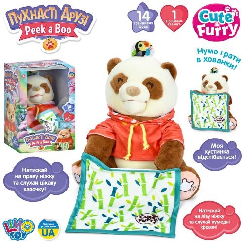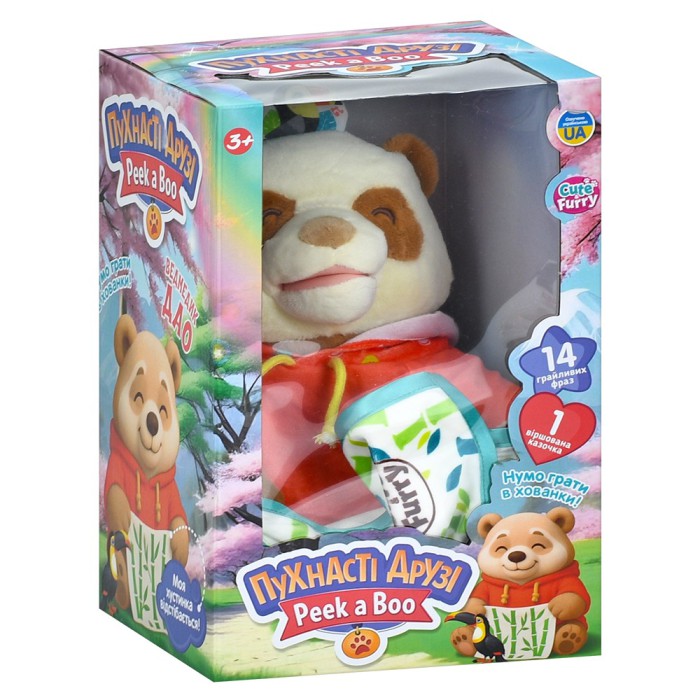 Панда грає в хованки, промовляє 14 кумедних фраз українською мовою, відтворює музику та читає 1 віршовану казку. Завдяки якісному озвученню й активним рухам, іграшка легко привертає увагу малюка та стимулює розвиток емоційного сприйняття.