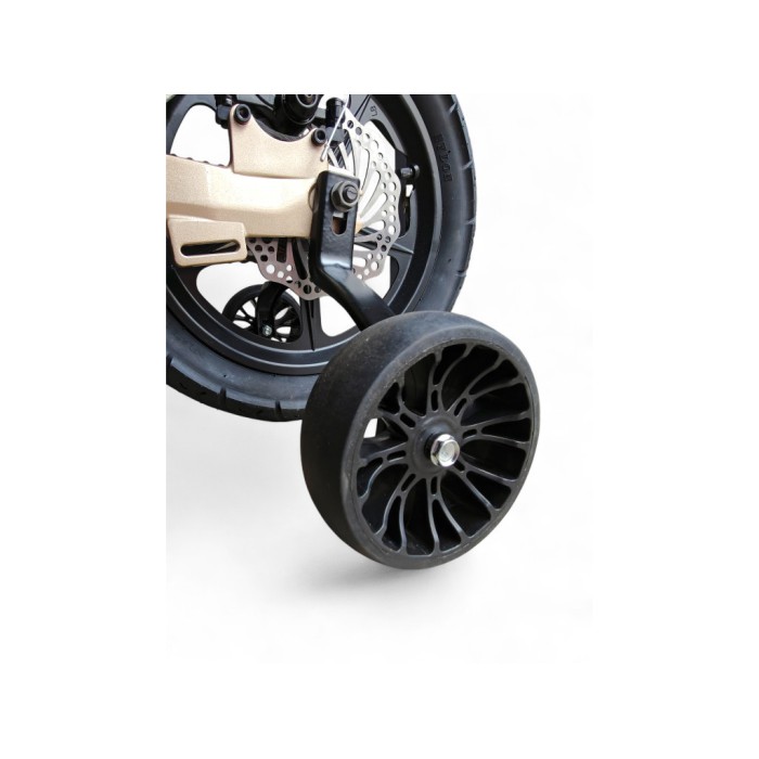Поліпшена лита рама, дискові гальма, регулювання нахилу керма, ліхтар, гумові додаткові колеса, дзвіночок