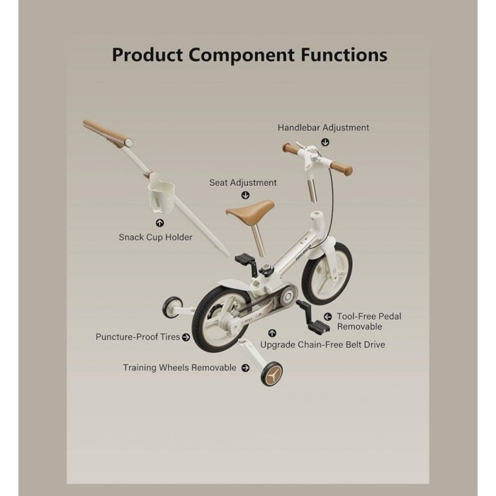 Ручне заднє гальмо забезпечує надійний контроль швидкості, а дзвінок додає безпеки під час прогулянок. Стильний білий колір виглядає сучасно та практично — велосипед довго зберігатиме охайний вигляд навіть при активному використанні.
