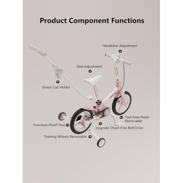 Регульоване сидіння допомагає ідеально підлаштувати велосипед під зріст дитини, забезпечуючи правильну посадку та комфорт під час катання. Батьківська ручка з можливістю регулювання висоти дає змогу дорослим контролювати рух на початкових етапах навчання. Додаткові страхувальні колеса підвищують стабільність і допомагають малюку швидше набути впевненості.