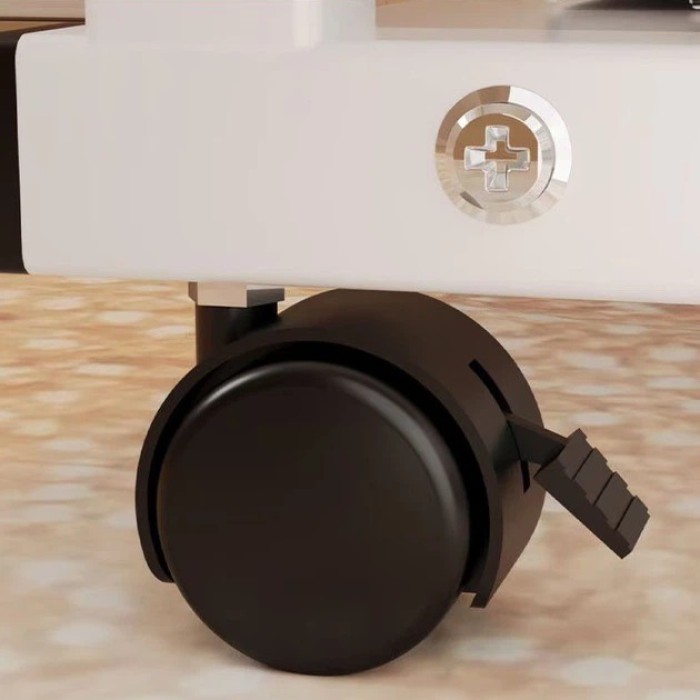 Мобільна конструкція на коліщатках забезпечує легке переміщення по кімнаті без зайвих зусиль. Дві полиці розширюють функціональність виробу, створюючи додатковий простір для зберігання аксесуарів, гаджетів або особистих речей. Надійна система фіксації висоти гарантує стабільність і безпеку під час використання. Столик виконаний у стильному чорному кольорі, що гармонійно впишеться в будь-який інтер’єр — від класичного до сучасного.