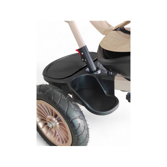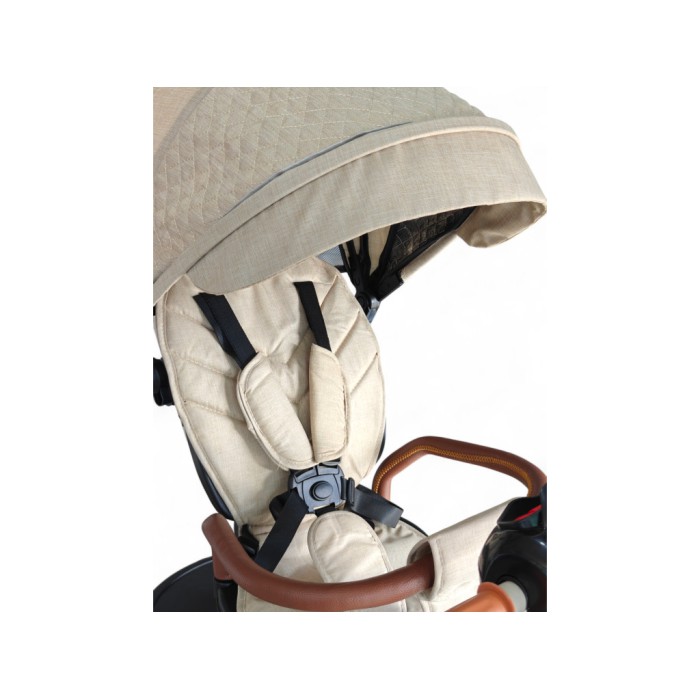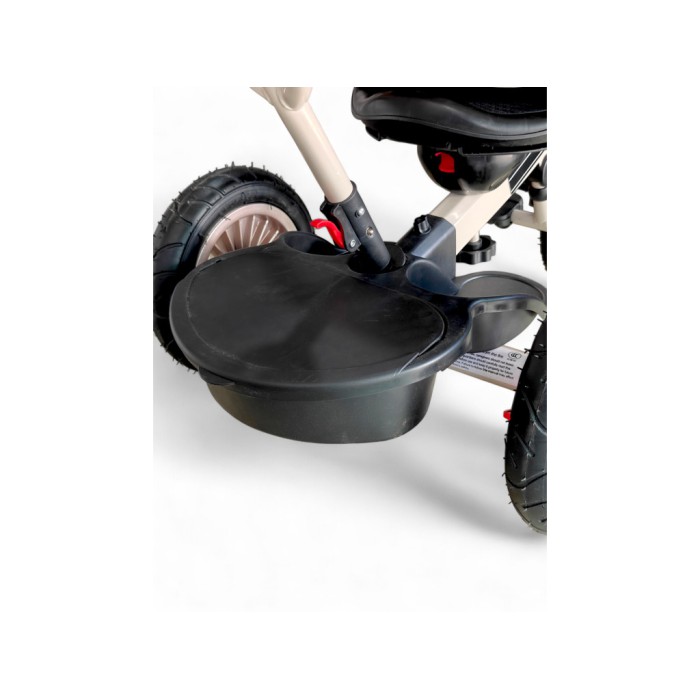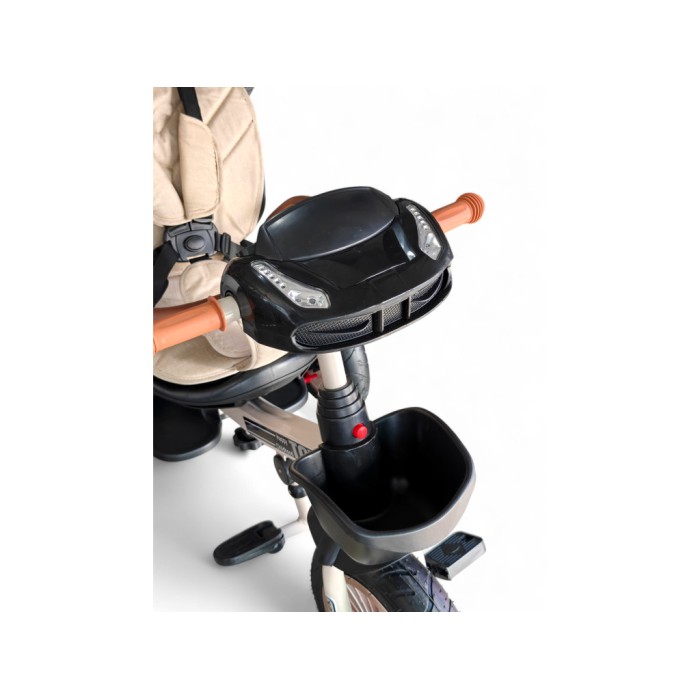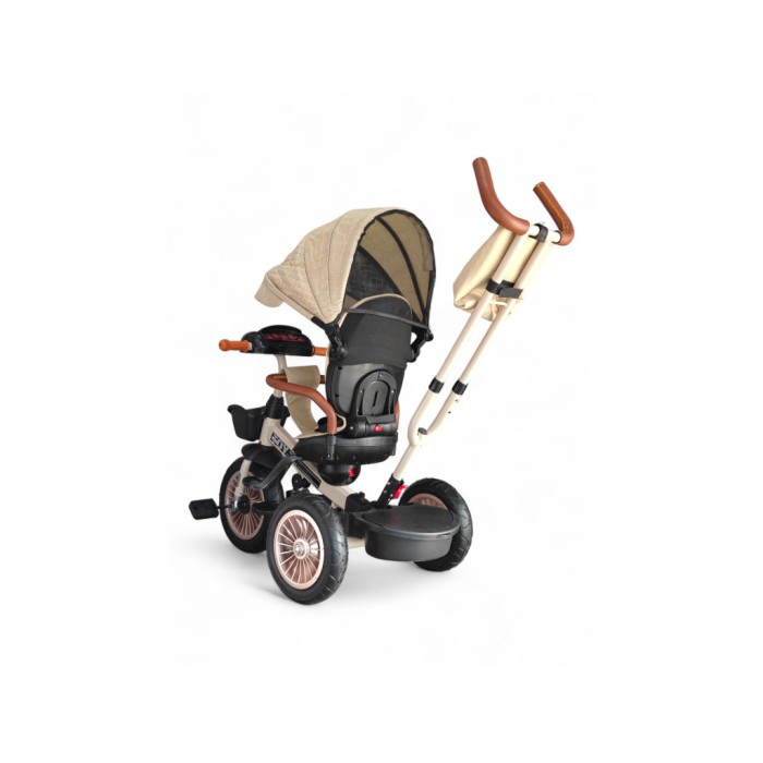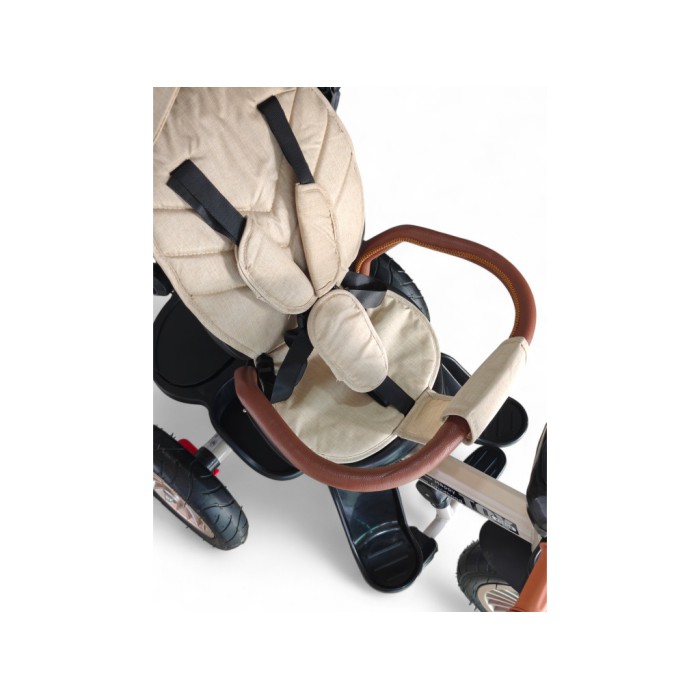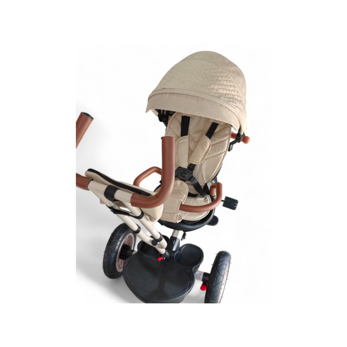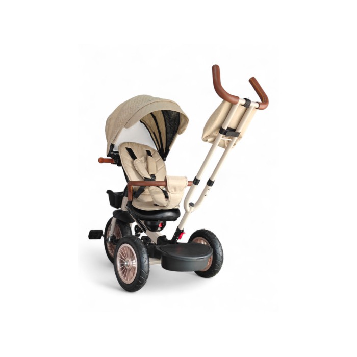 Завдяки поворотному сидінню на 360° дитина може їхати як обличчям до батьків, так і вперед за напрямком руху. Міцна сталева рама витримує навантаження до 60 кг, а непробивні гумові колеса гарантують плавний хід навіть на нерівних поверхнях.