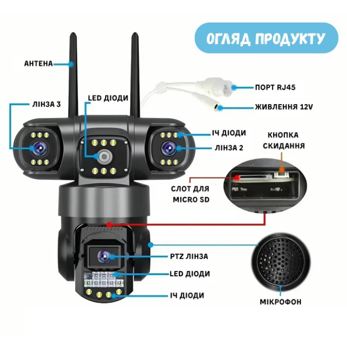 • Повний огляд без сліпих зон — три об'єктиви (4+4+4) забезпечують панорамне охоплення території.