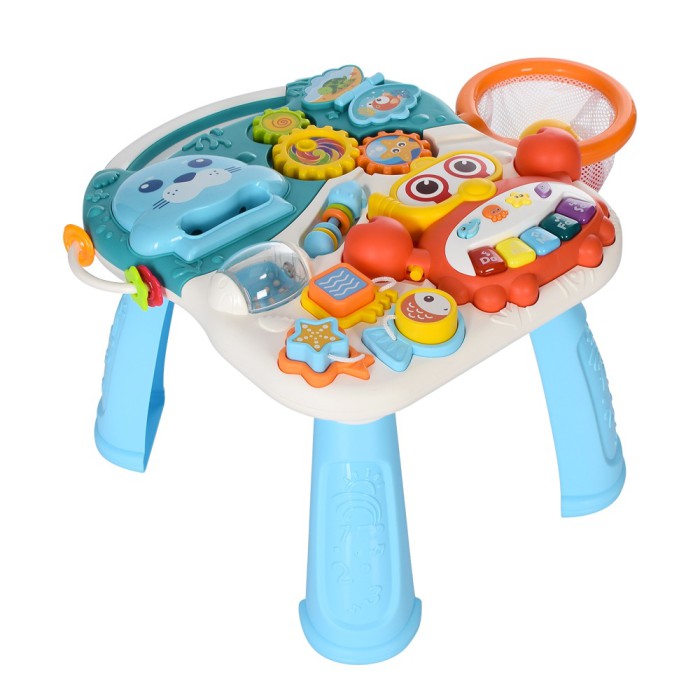 Іграшка обладнана музичним піаніно, світловими ефектами, шестернями, сортувальним блоком, а також баскетбольним кільцем із 3 м’ячиками, що робить гру ще веселішою. Підходить для розвитку моторики, координації, логіки та сенсорних навичок.