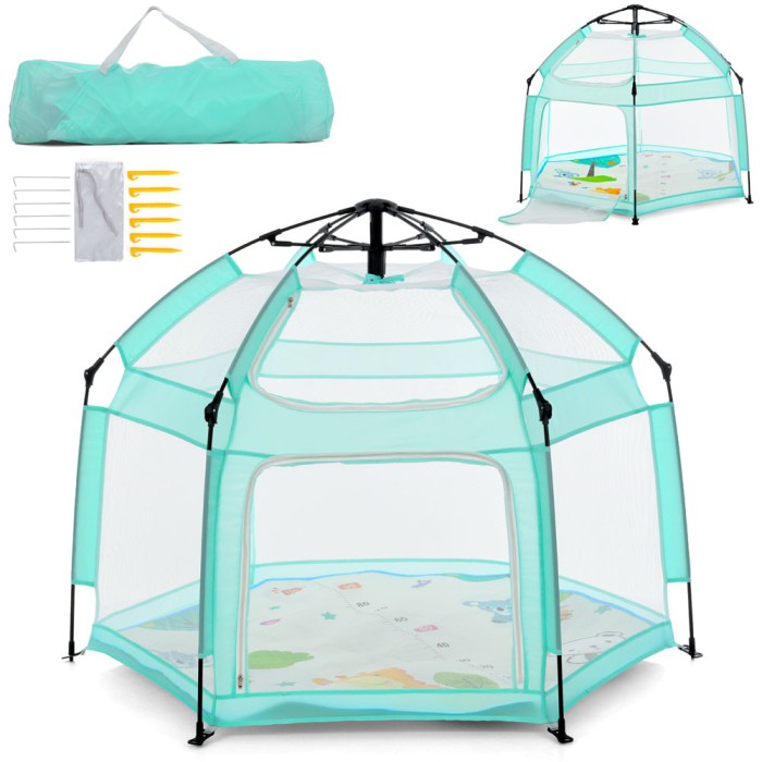 У комплекті передбачено м’який килимок із яскравим малюнком (136×114 см) — ідеальне місце для безпечних ігор, повзання, читання чи денного сну.