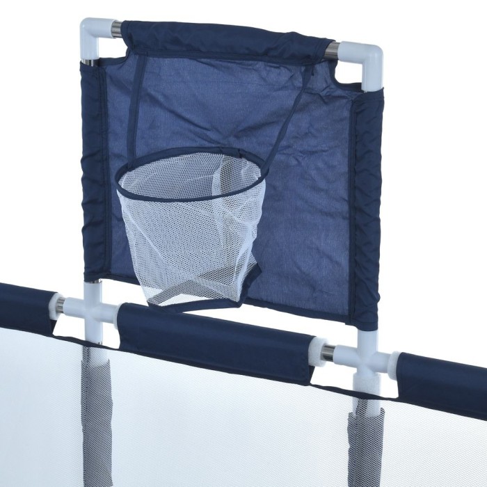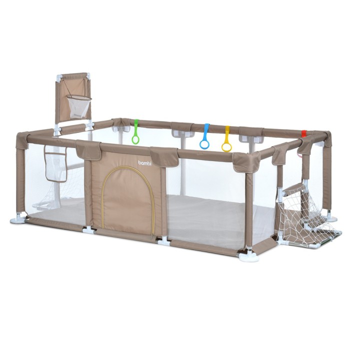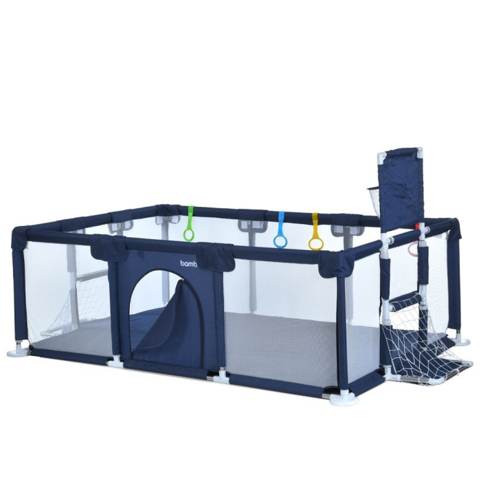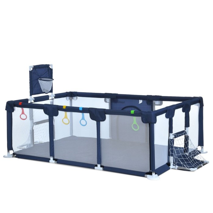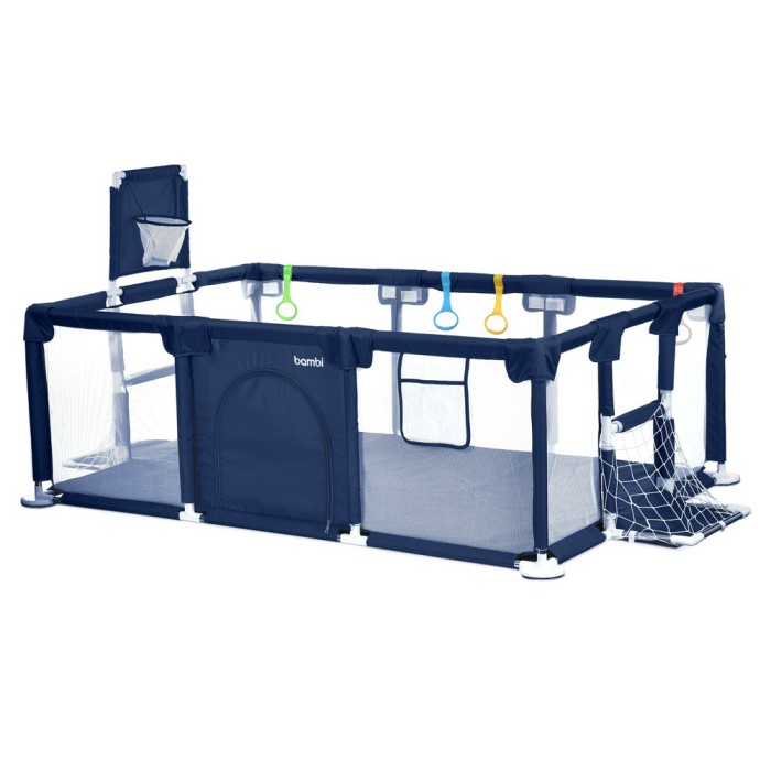 Манеж MR 1338-BL для дітей, складний, з м’якими бортиками та безпечною сіткою, з баскетбольним кільцем (синій, сірий, бежевий)