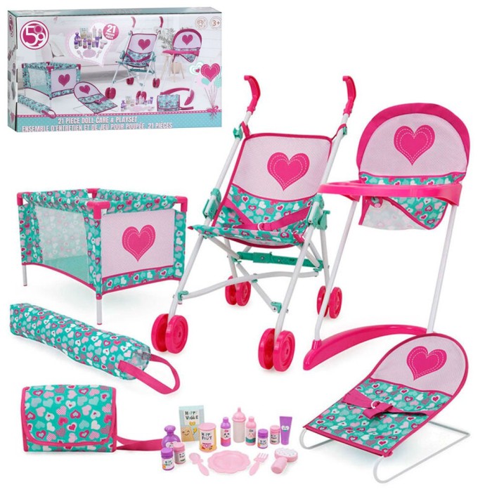 Набір для ляльки T816057 — коляска, стільчик для годування, манеж, шезлонг, сумка, 21 елемент