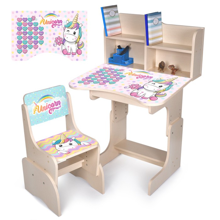 Дитячий навчальний комплект Bambi N 2071 — парта зі стільчиком, регулюванням висоти та надбудовою (дизайн “Єдиноріг”, світлий венге)