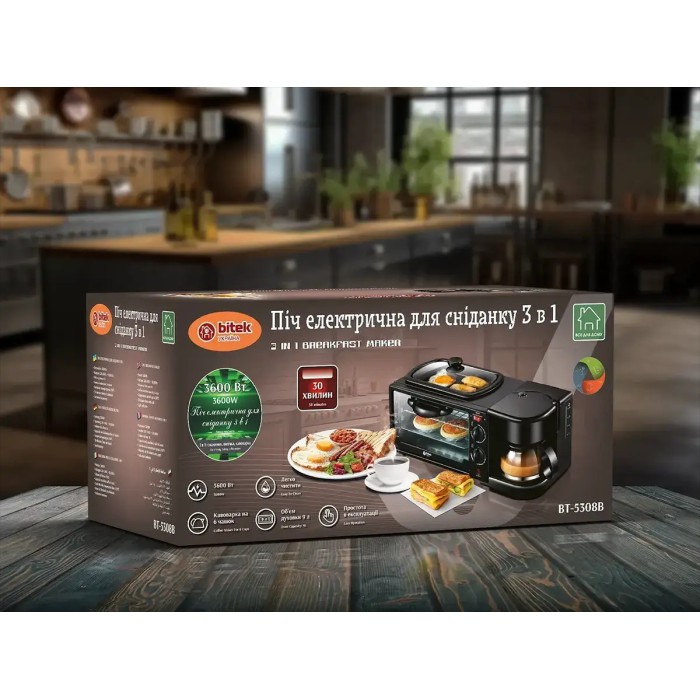 Піч електрична для сніданку 3 в 1 BITEK BT-5308B, 3600 Вт – тостер, гриль та багатофункціональна духовка