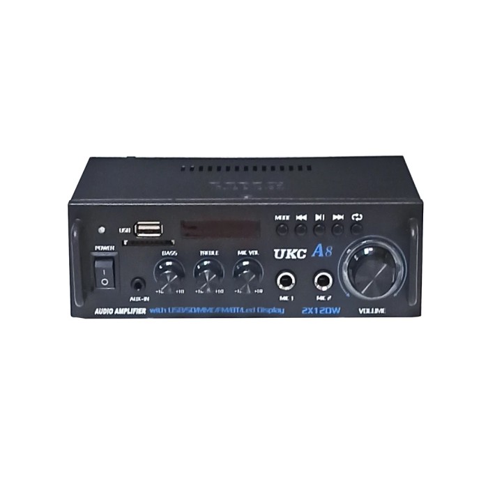 UKC A8 — це сучасний стереопідсилювач, який поєднує компактні розміри, зручне керування та якісний звук. Пристрій підходить для використання вдома, в офісі чи навіть в автомобілі, забезпечуючи чисте й насичене звучання при підключенні до будь-яких аудіоджерел.
