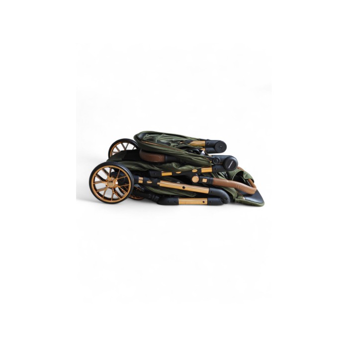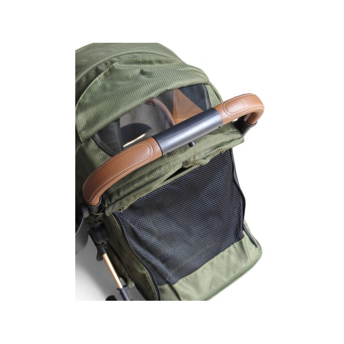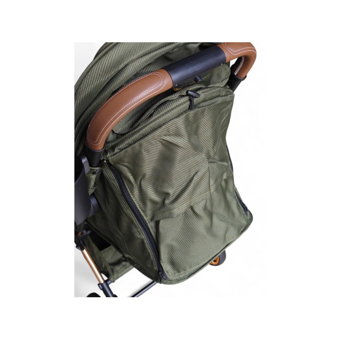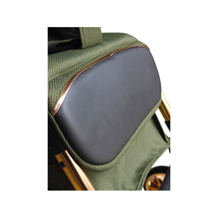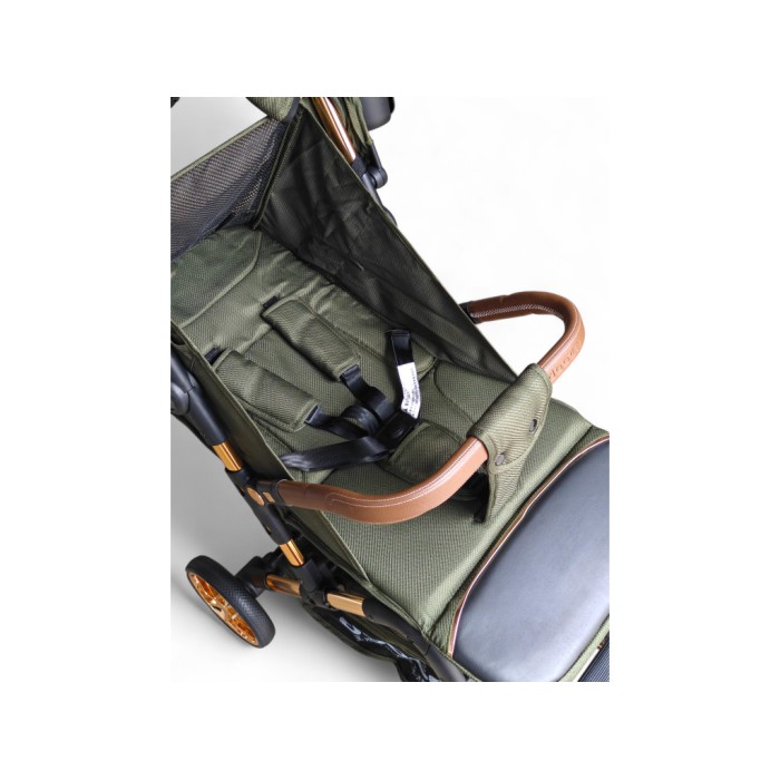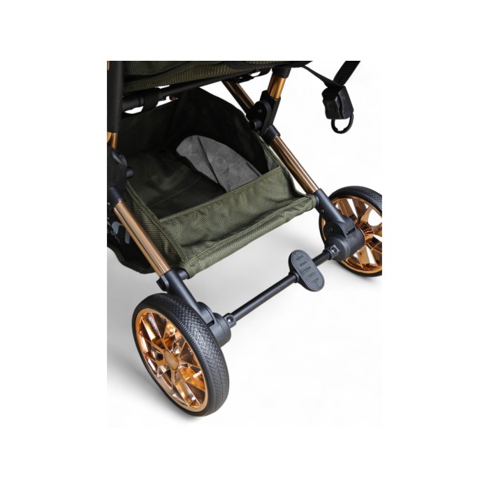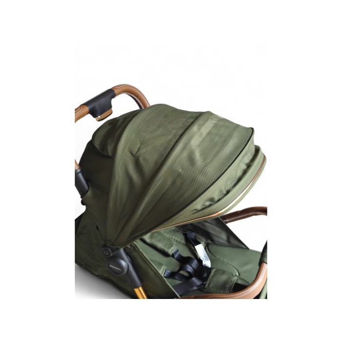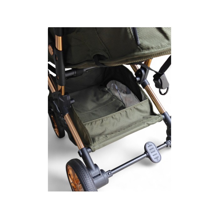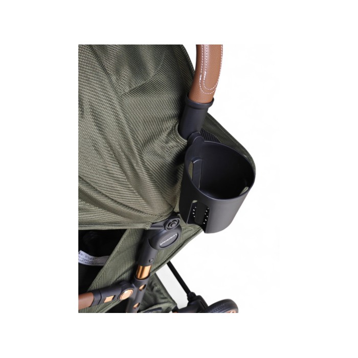 Підсклянник, передні колеса: амортизація, поворотні з фіксацією, спинка розкладається до лежачого положення, підніжка регульована, капюшон з вентиляційним віконцем, ремені безпеки, щільна текстильна тканина, кошик