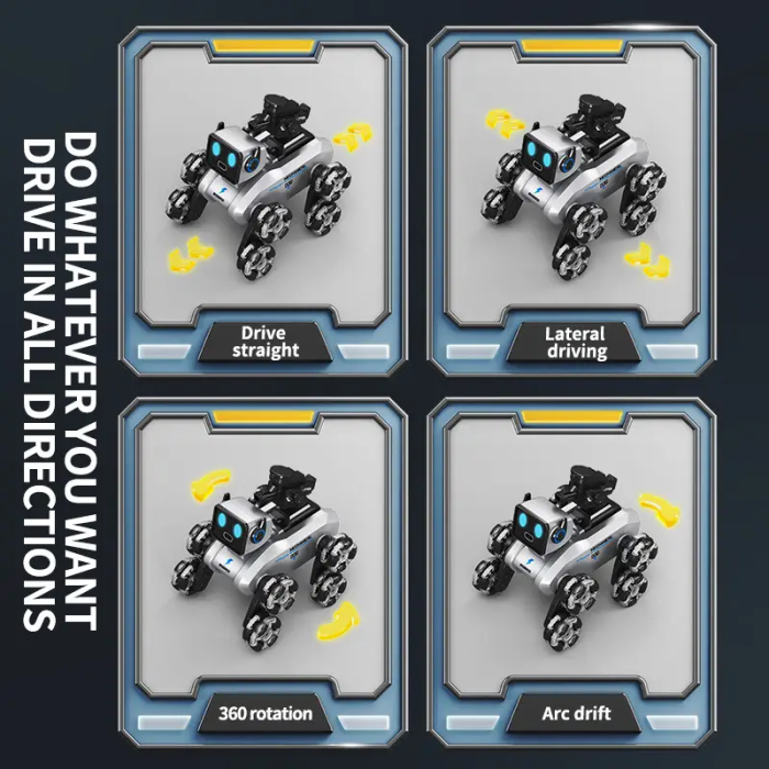 Робот-собака на колесах H29-3 + гармата — це захоплива інноваційна іграшка для юних шанувальників техніки та робототехніки. Цей восьмиколісний робот не просто рухається у різних напрямках, а й виконує дивовижні трюки, підсвічується яскравими LED-вогнями та оснащений гарматою для стрільби водяними кулями, що робить гру ще більш інтерактивною та веселою.