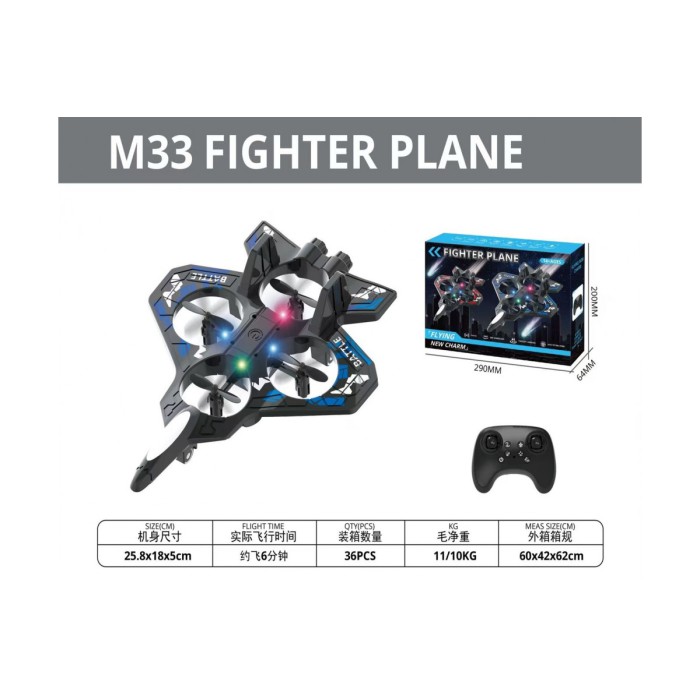 Літак-винищувач M33 з LED підсвіткою – це захоплива радіокерована іграшка для дітей, підлітків та дорослих, яка поєднує стильний дизайн винищувача та сучасні технології. Яскраві LED ефекти роблять польоти неймовірно ефектними навіть у темний час доби, а легке управління за допомогою пульта дистанційного керування дозволяє легко літати вперед, назад, виконувати розвороти та прості фігури пілотажу.