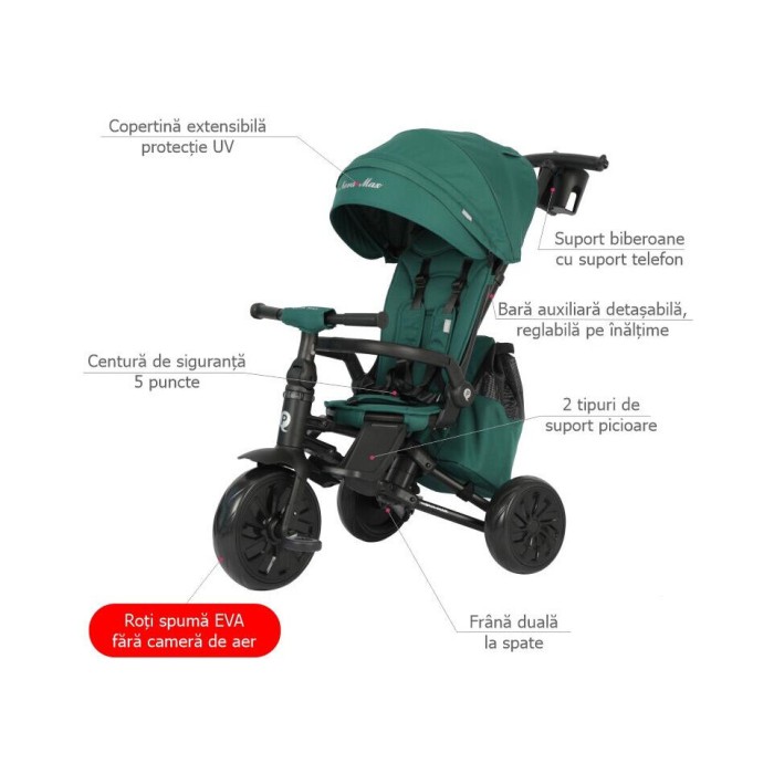 Tri-cycle NOVA оснащений високоякісними колесами EVA та задніми гальмами, що гарантує стабільність та безпеку. Батьківська ручка з регулюванням висоти та фіксатор керма дозволяють легко керувати велосипедом на будь-якій швидкості.