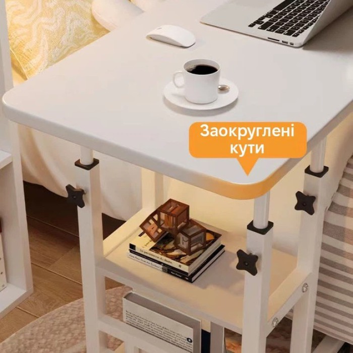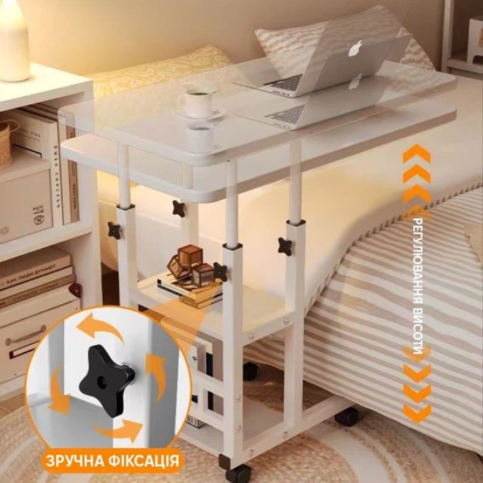 Мобільна конструкція на коліщатках забезпечує легке переміщення столика по кімнаті. Додаткова полиця дає місце для аксесуарів, документів або особистих речей. Надійна фіксація висоти за допомогою гвинтів гарантує стабільність навіть при активному використанні.